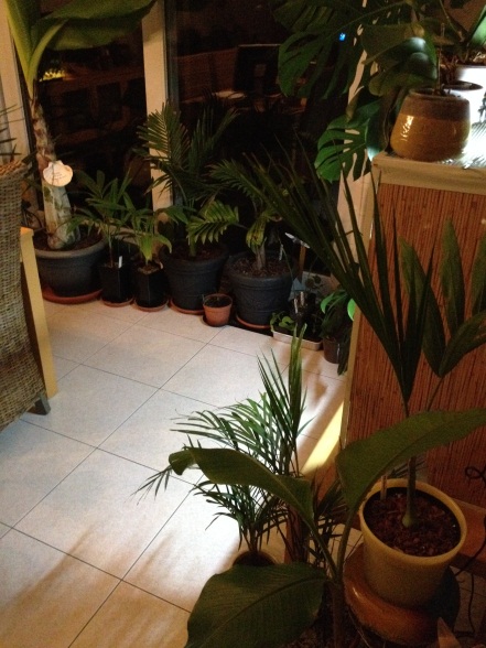 Ondanks dat het ook daar lekker gezellig is qua palmen, houdt ik de creche op zolder (26m2 ruimte, altijd een pak warmer dan de huiskamer en een partij glas maken het ideaal rommelen daar).