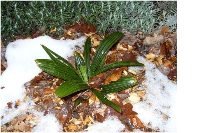 En nog eentje uit januari 2011, toen had ie nog nauwelijks gedeelde bladeren. Hier zie je ook goed wat ik aan bescherming doe: alleen een laag blad/houtsnippers rond de plant. Verder niets, geen afdak, geen verwaring, niets.En dus de afgelopen vier jaar geen schade, op wat bruine pikkeltjes op sommige balderen (zie foto 2013).