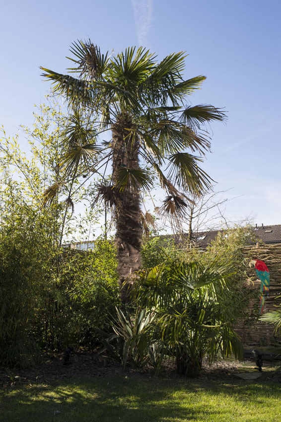 Van de totaal 4 grote trachy's die we 4 jaar geleden hebben verhuist, leeft er nog maar 1. Einde van de zomer hebben de lange slungel uit de grond gehaald, hij bleek niet geworteld te hebben, weer een trachylijk :? Verder hebben we ook de bamboepoort eruit gehaald en vervangen door een groot smeedijzeren hek. Een paar weken geleden is er namelijk een grote hond in onze tuin terecht gekomen en heeft 5 van onze kippen doodgebeten, 1 groot drama dus we hebben direct onze tuin hermetisch afgesloten voor honden! We hebben inmiddels ook weer nieuwe kipjes ook al zit de schrik er nog goed in!