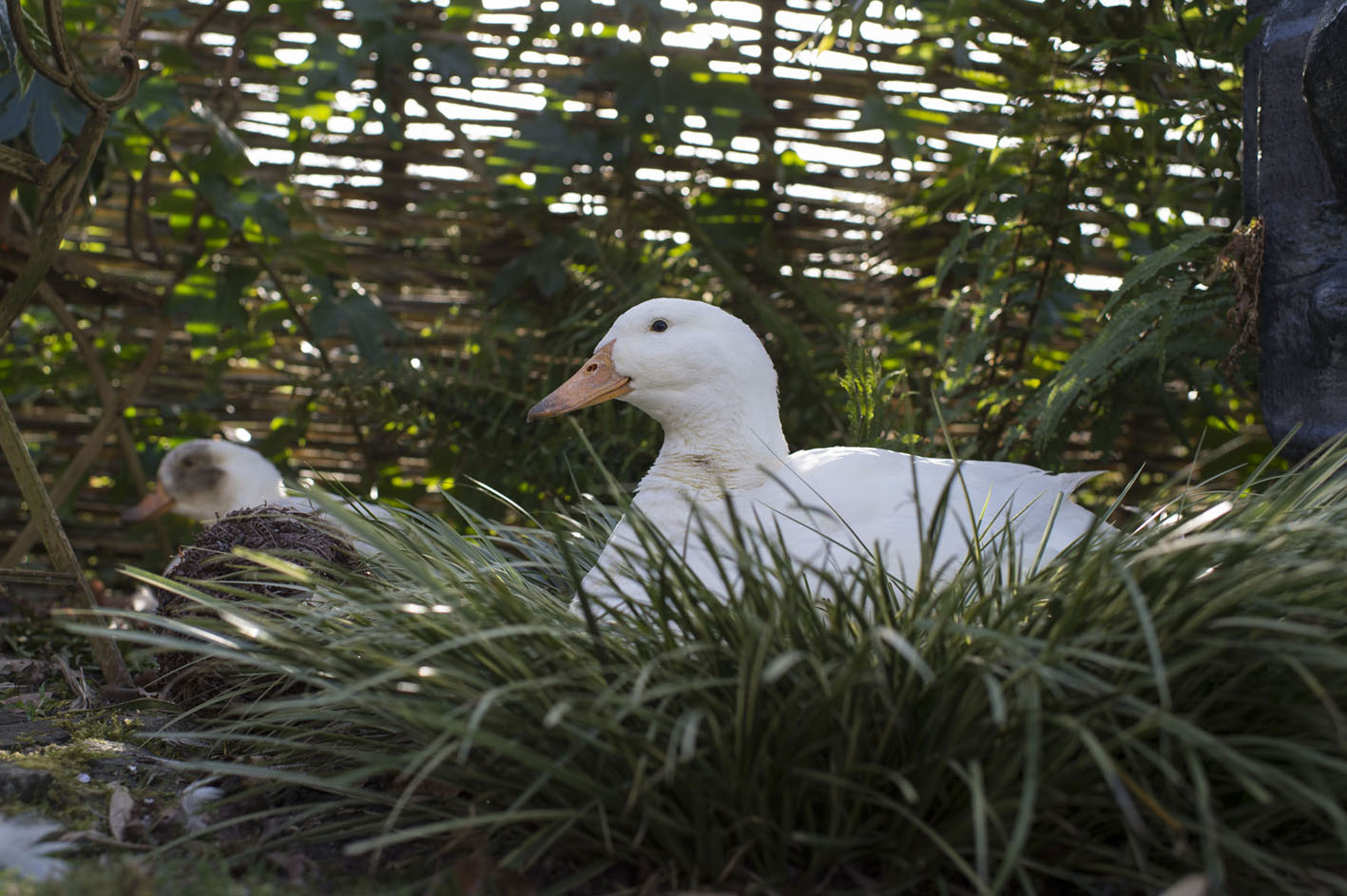 Pekingeend Antonio ligt zo graag bovenop deze grasplant.....