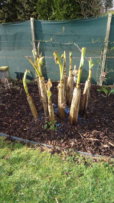 hier staan de grote stammen van de basjoo ook weer in de volle grond hoor :D en de groei zit er al weer in. mocht het toch nog gaan vriezen ga er een rol noppenfolie omheen