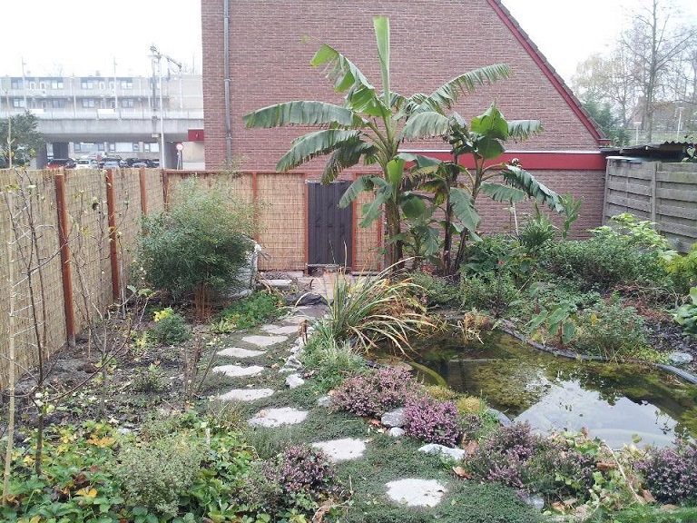 De Musa's naast mijn huis. Ook een basjoo en een sikkimensis maar zoals gezegd kleiner dan de Musa's in mijn achtertuin. Verder heb ik in de herfst van 2013 een Albizia julibrissin geplant. Dit keer gelijk maar een grote omdat ik er al één verloren ben en grote exemplaren een betere overlevingskans schijnen te hebben. Tot nu toe lijkt dat inderdaad het geval. Hij begint voorzichtig al weer wat uit te lopen maar valt op de foto nog volledig weg tegen de struik die erbij staat.