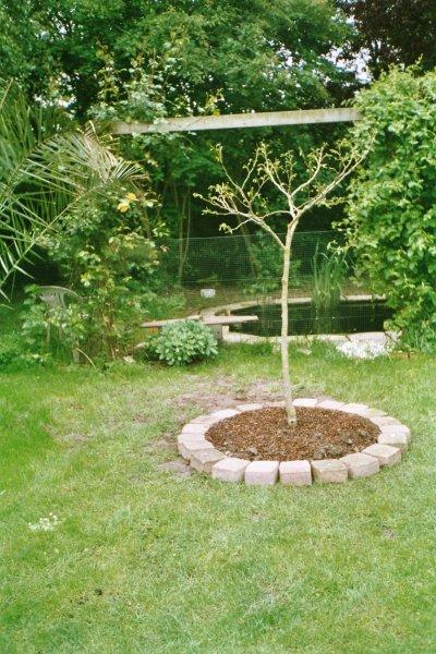 bij de aanplant in april 2004 , en een foto van juli 2013. Hij wordt wel elk jaar goed gesnoeid, sommige takken groeien tot 1 m per jaar. De albizia staat ongeveer in het midden van de foto