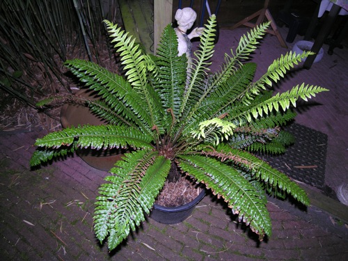 Hier heeft een Arachniodes simplicior 'Variegata' de afgelopen winter (kuch) overleefd in de volle grond.