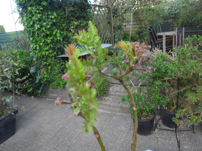 De eerste maal dat ik hier een bloeiende Jacaranda ga zien, de plant is 5 jaar en ziet er helemaal niet uit maar de drie bloemknoppen maken dat wel goed denk ik.