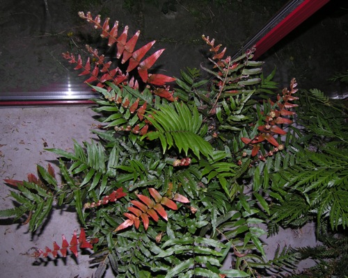 Ter introductie een paar mooie exotische varens, waarvan je zou wensen dat ze vaker worden aangeboden, Blechnum wattsii en Blechnum discolor. Waarbij de eerstgenoemde de meest kleurrijke soort is. Een vroege poging om B. discolor (zone 8) tegelijk met de eveneens fraaie Blechnum fluviatile (zone 6, volgens Martin Rickard) in de tuin te houden, mislukte faliekant. Ook de soorten magellanicum en novae-zealandiae lieten het na enkele seizoenen afweten.