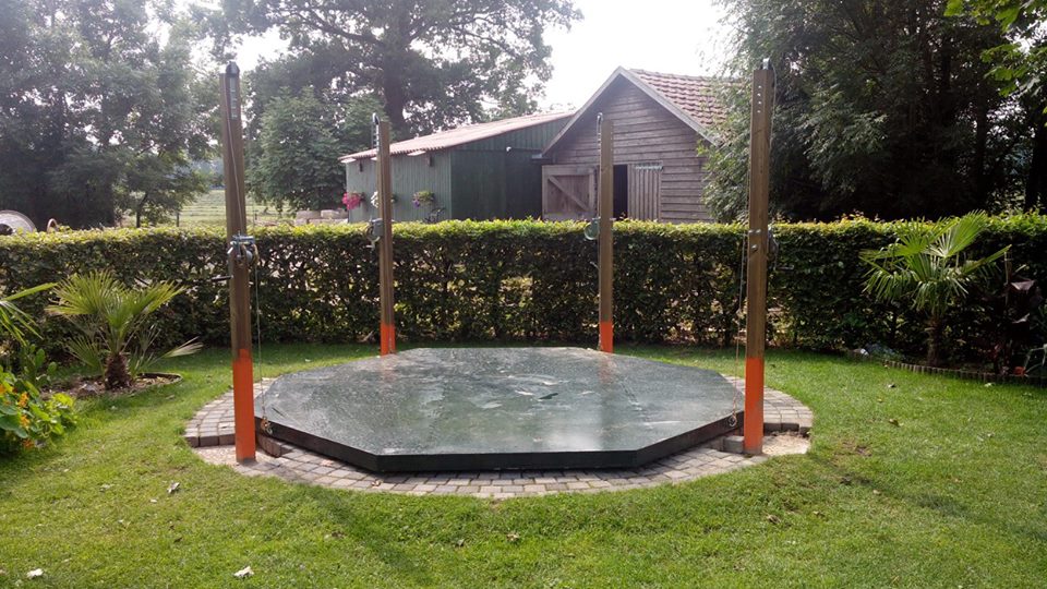 Gaten maken voor de 4 palen die het dak moeten lieren, wat heb ik een spijt dat ik destijds met het maken van het zwembad zo verschrikkelijk veel beton heb gestort om de wanden, ik ben echt 3 dagen aan het beton hakken geweest om de palen te kunnen zetten. Daarna dacht ik eventjes totaal aan 1 kub beton genoeg te hebben om de palen strak aan het zwembad te zetten, dat werd 3 kub beton storten, maar het beton met de palen zit nu vast geankerd met betonijzer aan het zwembad. Mocht ik ooit verhuizen dan wordt dat een leuk klusje, het bad met palen en dak moet er in 1 geheel uit of het word sloop haha.