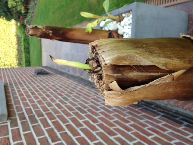 Nu, na de onthoofding, doen de nieuwe pups van deze planten het heel goed. En komt er zelfs een nieuw blad uit de 'onthoofde' stam. Wat betekent dit, is de plant aan heropbouw bezig? Of toch maar aan het uitbollen?