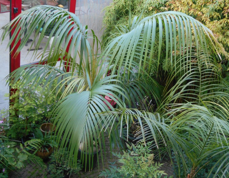 Howea gedijdt ook prima binnenshuis zelfs bij wat lagere lichtcondities. Bij mijn grootouders stond een grote cluster in de 's winters onverwarmde voorkamer onderdeel van een ouderwetse kamer en suite met een respectabele hoogte van 4,50 m en dito hoge ramen. Dan is het tegenwoordig ernstig behelpen met een woonkamer van 2,45 m zoals hier in huis.