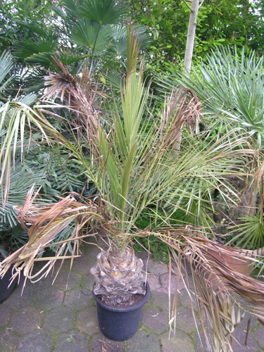 Vandaag ontving ik een exemplaar van deze Phoenix welke ik een tijd geleden via eBay in Spanje heb besteld. Uitgepakt stelde het beeld tamelijk teleur. Weliswaar heeft de palm een stevig postuur, maar was een aanzienlijk deel van de veren bruin verkleurd. Om aanhoudende ergernis te voorkomen heb ik deze afgeknipt, zodat nu een schaars bebladerde knoest resteert. Vers opgepot de palm in de kas gezet en afwachten op de ontwikkelingen.