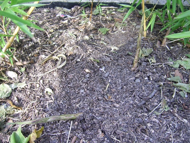 Vandaag ook even foto's gemaakt van de Ph. vivax aureocaulis naast mijn huis. Een paar mooie scheuten. Maar ook een paar wortelstokken die boven komen en misschien in een scheut gaan eindigen maar dus erg schuin staan. Ik hoop en verwacht dat er nog heel wat scheuten bij komen want die paar die er nu zijn is nog erg weinig.