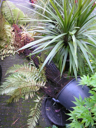 De regen met harde rukwinden leverde ondanks alle voorzorgen toch nog een verrassing op. Cyathea cunninghamii lag vanavond plat alhoewel deze met 3 kabels verankerd is. Na enig gepruts, de nylonkoorden moesten eerst worden losgemaakt, staat de varen nu weer overeind met een extra lijn. Het wordt hoog tijd dat deze knaap een nieuwe bestemming krijgt. Wellicht heeft er iemand een suggestie? Ik heb al contact gezocht met enkele beheerders van plantenzamelingen, Burgers, de Orchideeënhoeve en Hortus Amsterdam. Als er zich geen gegadigde aandient, is mijn laatste optie de Cyathea op te offeren met behoud van de lagere Dicksonia die er tegenaan groeit. Misschien dat hiervoor meer belangstelling is