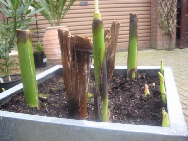 Dit is het eerste jaar dat ik canna's heb en ik heb dus totaal geen ervaring. De canna Musafolia vertoont nog geen teken van leven, zijn die altijd later als de Stuttgart?