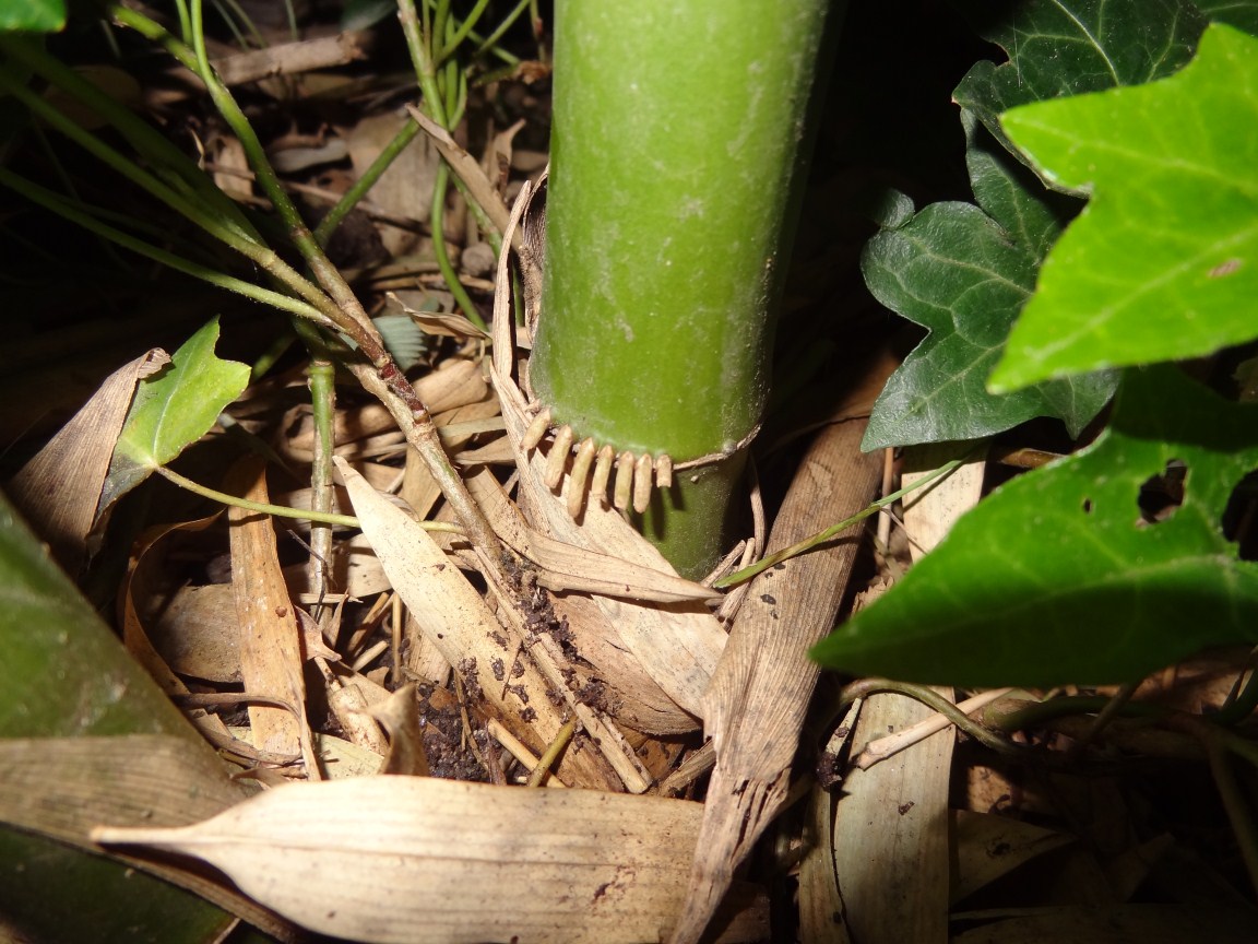 @Anouk: het lijkt inderdaad op een Semiarundinaria Fastuosa (zuilbamboe) zoals reeds aangegeven door Etienne. Een volwassen exemplaar hiervan is vrij goed herkenbaar. Dus als je een foto kan bemachtigen van de moederplant....... @Etienne: Dat het geslacht Phyllostachys geen wortels maakt op de onderste ring kan ik niet bevestigen, heb nog snel een paar foto's gaan nemen(in het donker) van m'n Phyllostachys ; de eerste is een fimbriligula de tweede is de atrovaginata.