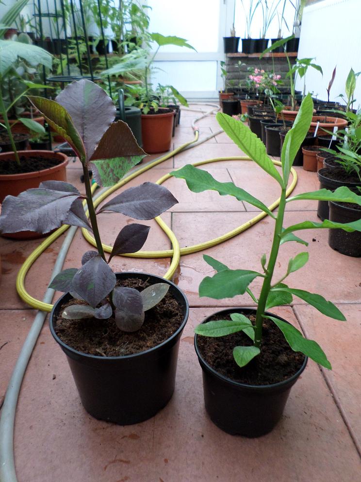 De roodbladige stek is een Synadenium grantii. Het groene exemplaar kan dezelfde soort zijn :?: , want deze wordt ook wel 'chamaeleon' plant genoemd. Behoort tot de Euphorbiaceae. Het melksap is giftig en je moet daarbij vooral oppassen dat het niet in de ogen komt. De giftigheid verschilt per soort, maar met name het sap van de bekende kamerplant Euphorbia tirucalli kan blindheid veroorzaken. Snoeien is nu en dan gewenst om de plant bossig te houden. Bloei hoef je hier niet te verwachten.