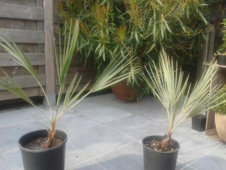 Ik heb onlangs een chamaerops humilis 'cerifera' aangeschaft, en vandaag is er een Brahea Armata bijgekomen. Als ik deze 2 palmen naast elkaar zet zie ik eigenlijk geen of weinig verschil. Kunnen jullie de verschillen tussen deze 2 soorten zien (of zijn het dezelfde soort?) Het enige verschil dat ik kan zien is dat de Brahea iets blauwer is dan de cerifara.