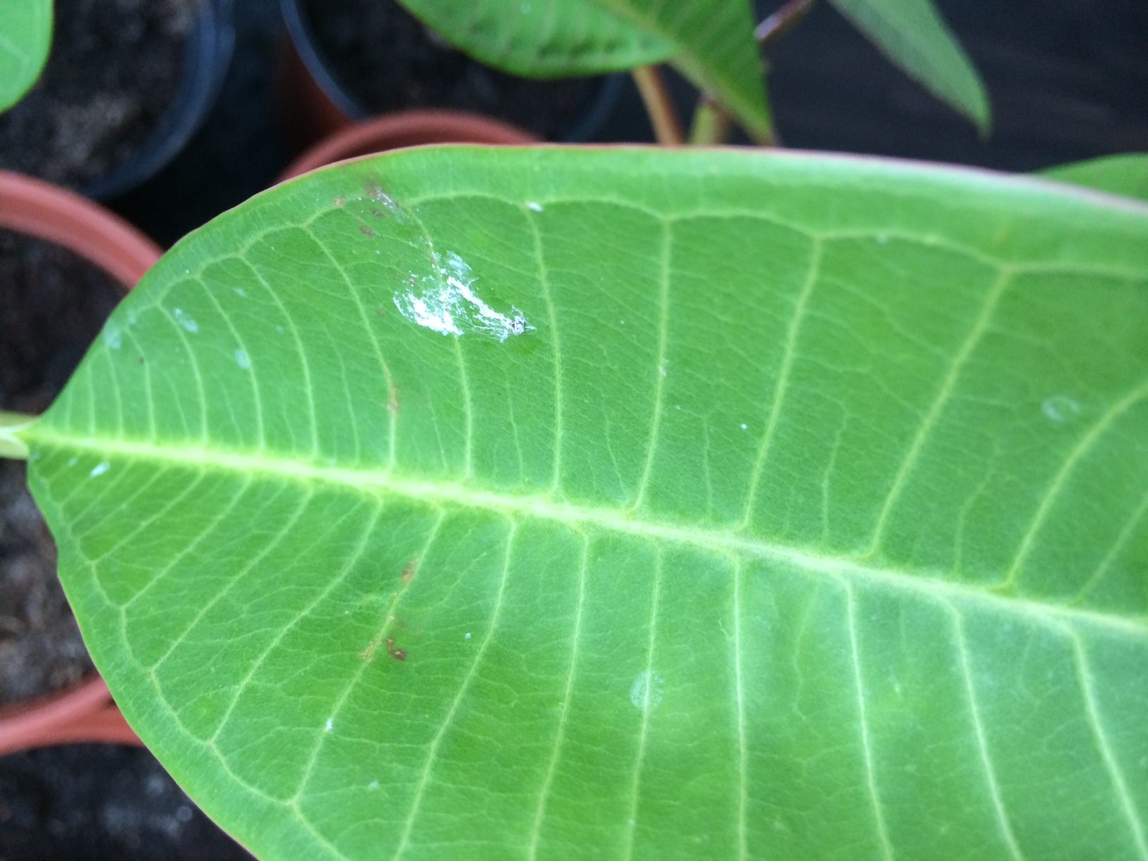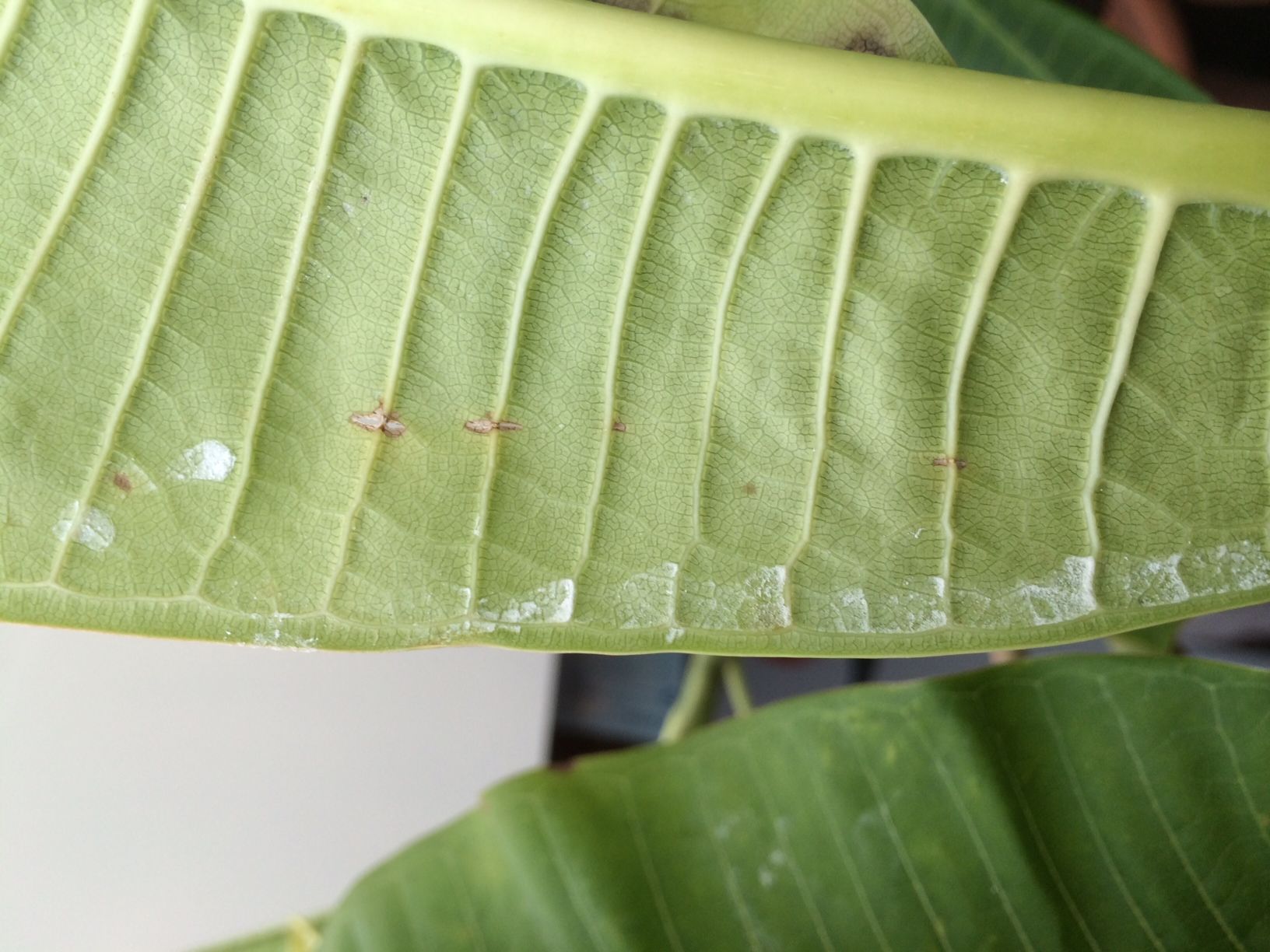 Helaas doen ze het niet zo goed. Ze verliezen bijna allemaal bladeren, en vanmorgen merkte ik dat er 3 plumeria's hun bloemstengel kwijt zijn (jammer, ze bloeiden zo mooi allemaal!). Nog eens een nadere inspectie later zie ik kleine witte vlekjes, droog. Vooral aan de bovenkant van het blad, een enkele plumeria heeft er ook onderaan (zie foto's). Volgens mij geen spint, maar wat dan wel? En vooral: hoe kom ik er vanaf?