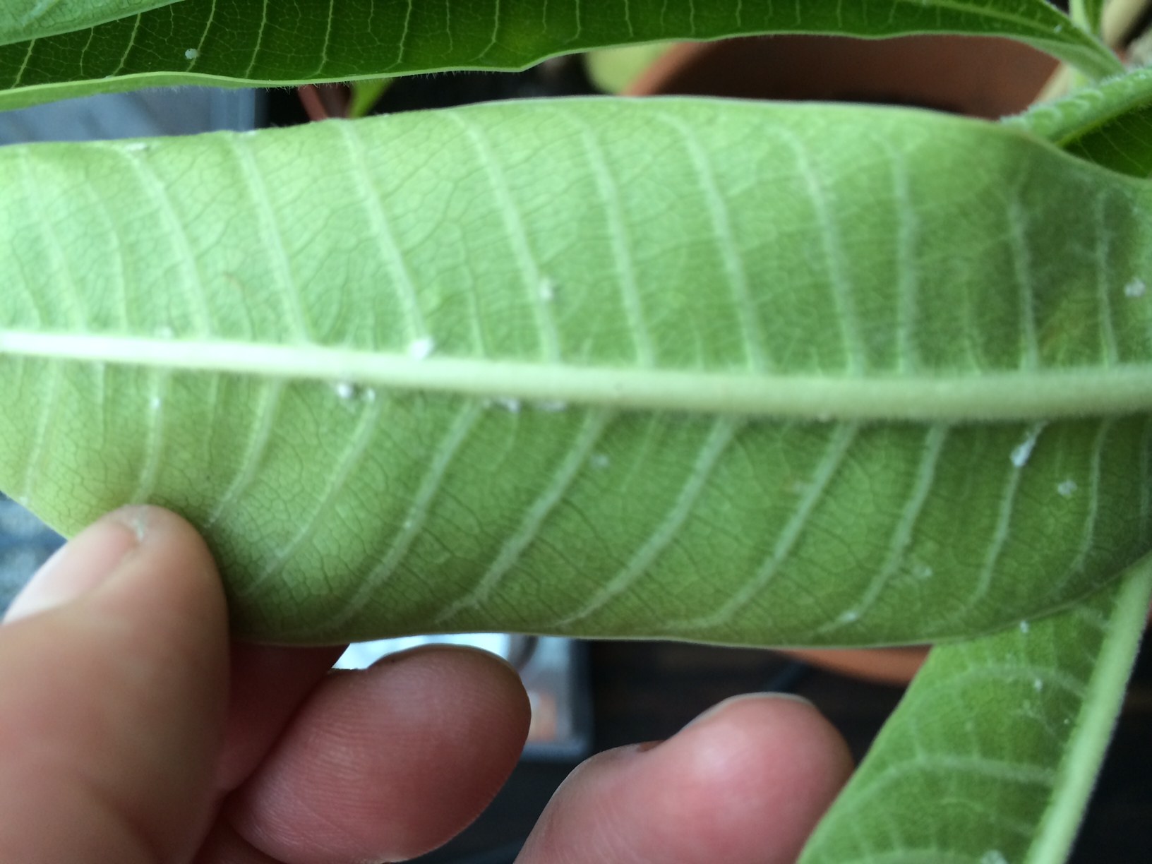 Helaas doen ze het niet zo goed. Ze verliezen bijna allemaal bladeren, en vanmorgen merkte ik dat er 3 plumeria's hun bloemstengel kwijt zijn (jammer, ze bloeiden zo mooi allemaal!). Nog eens een nadere inspectie later zie ik kleine witte vlekjes, droog. Vooral aan de bovenkant van het blad, een enkele plumeria heeft er ook onderaan (zie foto's). Volgens mij geen spint, maar wat dan wel? En vooral: hoe kom ik er vanaf?