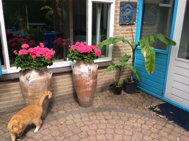Op de achtergrond een musa basjoo met meerdere stammen in een grote regenton. Elk jaar voor de winter gaat al het blad eraf en een deel van de stammen om vervolgens in het schuurtje te overwinteren.