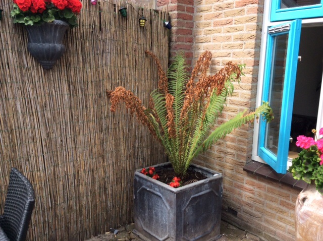 Deze varen stond voor kort in de volle grond. Vandaar het bruine blad. Komt volgend jaar helemaal goed