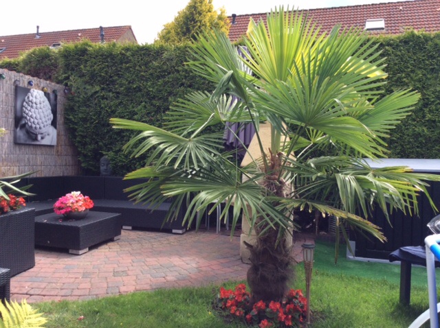 Trachycarpus Fortunei met redelijk stijve bladeren. Wellicht een kruizing met Wanerianus?