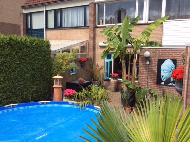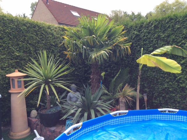Hierbij 20 foto's van mijn exotische tuin. De tuin is niet erg groot maar ik heb wel geprobeerd om het te voorzien van alle gemakken en exotische gezelligheid. Het heeft relaxgedeeltes, in de zomer lekker afkoelen in het zwembad rondom de palmen. Dit is iets wat ik altijd al gewenst heb. Gelukkig is dat mogelijk met veel winterharde soorten groen. In de tuin is er ook volop verlichting maar die foto's houden jullie nog tegoed ;-) Ben benieuwd wat jullie ervan vinden.
