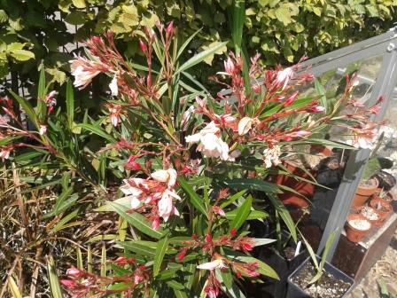 Nerium oleander 'provence' die in volle grond staat doet het hier uitstekend. Goede groei en veel bloemen. Ik ben aan het twijfelen om hem deze winter in volle grond te laten staan of om hem toch maar weer uit te graven en hem binnen te laten overwinteren :?