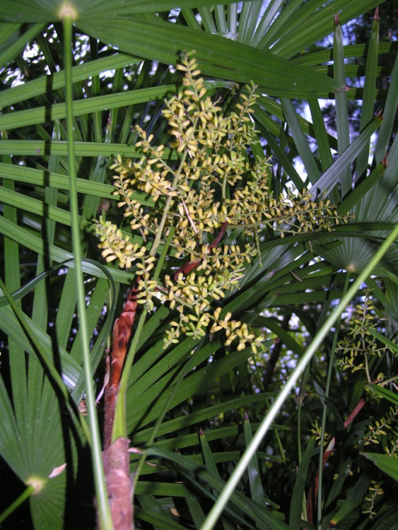 Rhapis humilis of multifida bloeit hier momenteel synchroon op een aantal van de 'stammen'. Omdat het mannelijke bloeiwijzen zijn, is niet met zekerheid vast te stellen of het de soort multifida is of een humilis. Van de laatste soort zijn uitsluitend mannelijke clonen bekend. Bij de multifida zijn beide geslachten voorhanden. Deze is dan ook uit zaad te vermeerderen. De bescheiden gele bloemen bevatten waarschijnlijk 3 meeldraden binnen een buisvormige kroon. Ze zijn alleen onder een microscoop te zien in een overlangse bloemdoorsnede.