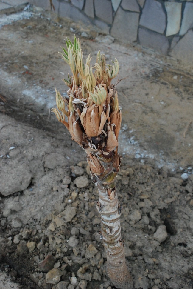 Ik ben net even gaan piepen in de tuin. Ik heb er 3 staan. De grootste die geen winterschade had begint ook aan zijn blad-knop vorming, bij de andere die wel winterschade hadden (de top was zacht/rot) is er groei merkbaar; uit het centrum van de stam begint er een harde kern te groeien.