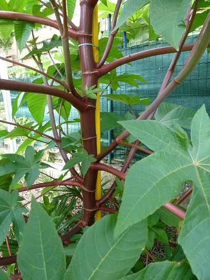 De volledig groene is de ricinus zanzibarensis en de gene met rode stelen is de Ricinus Gibsonii .