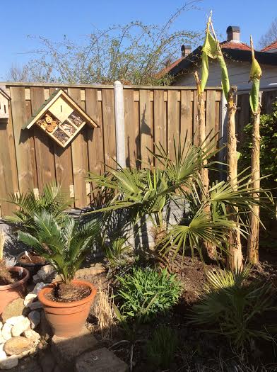 De voortuin moet dit jaar minder druk als vorig jaar, ik heb de tetrapanax verplaatst + de musa basjoo. De laatste heb ik bij de andere basjoo gezet om een grotere/vollere plant te krijgen. In de winter is dit ook een stuk makkelijker te beschermen. De tetrapanax staat nu in de achtertuin in de schaduw/half zon border met als onderbegroeiing varens, slaapkamergeluk met als buren de mooie bamboe Chimonobambusa tumidinoda. Ook de grote krenteboom is er uit dat betekent meer ruimte voor de bananen :) Alle tropische palmen + boomvarens staan met deze dagen nu in de schaduw om verbranding te voorkomen.