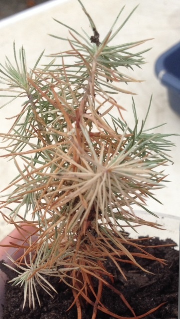 Uit de zon houden, niet te nat, maar ook zeker niet uit laten drogen en hopen....Ik heb er een paar jaar gelden een uit de grond gespit met weinig wortels en die werd ook aardig bruin. Maar herstelde volledig in de vollegrond uitgeplant.