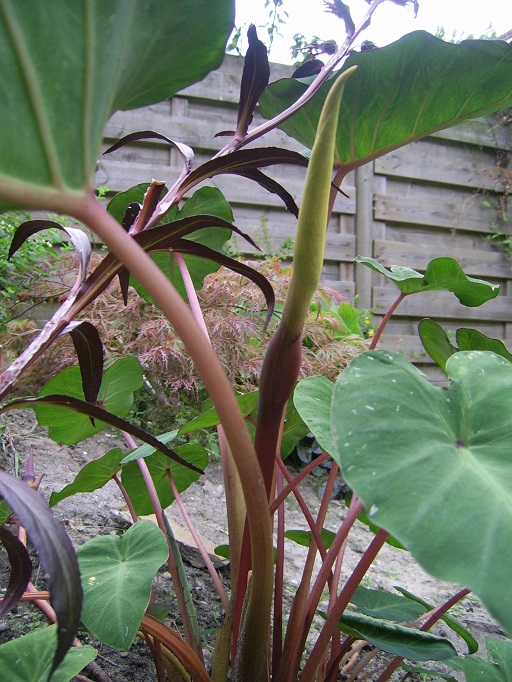 Dit jaar heb ik bij Palmaverde 2 Colocasia Pink China planten besteld. Bij levering was er 1 plant hoog en donkergroen en de andere plant bestond uit een vollere bos kleine bleke plantjes. Ik dacht eerst dat het verschil wel weg zou trekken omdat het tenslotte hetzelfde ras zou zijn. Misschien verschil in kweekomstandigheden gehad, voedselgebrek of koude waardoor de ene plant bleker en kleiner was gebleven. Of misschien een ziekte.