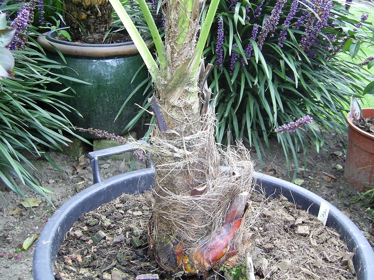 Ik heb de 'manipur' in de tuin geplant omdat ik deze als kuippalm niet kon waarderen. Hij staat nu verscholen achter beplanting op de achtergrond onder hoge bamboe en doet z 'n best om daarmee te concurreren.