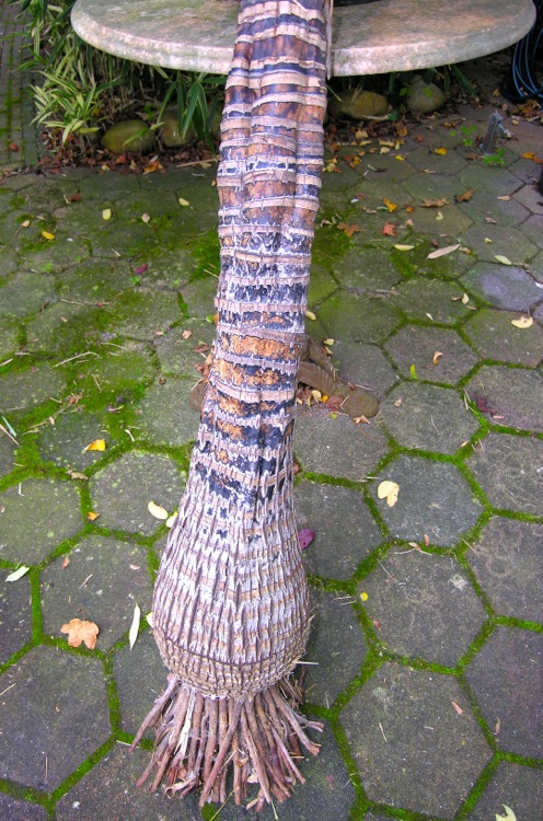 Het lijkt niet verstandig om je hutje uit palmhout op te trekken. De kern van de stam van een palm bevat veel vocht en na verloop van tijd wordt de stam zacht of krimpt deze. De afgebeelde stam van een Howea is zichtbaar ingedroogd en verschrompeld. De stam van een Trachycarpus daarentegen behoudt zijn vorm, maar wordt na enkele jaren sponsachtig. Ook de harde stam van Phoenix roebelenii met zijn karakteristieke bladsteelresten is na verloop van tijd indrukbaar.