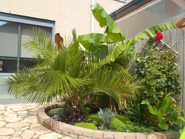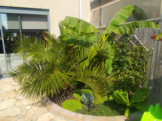 hier zijn nog wat foto's van onze tuin van 1 border staan verschillende foto's op waar je goed de groei van de bananenbomen kunt zien .