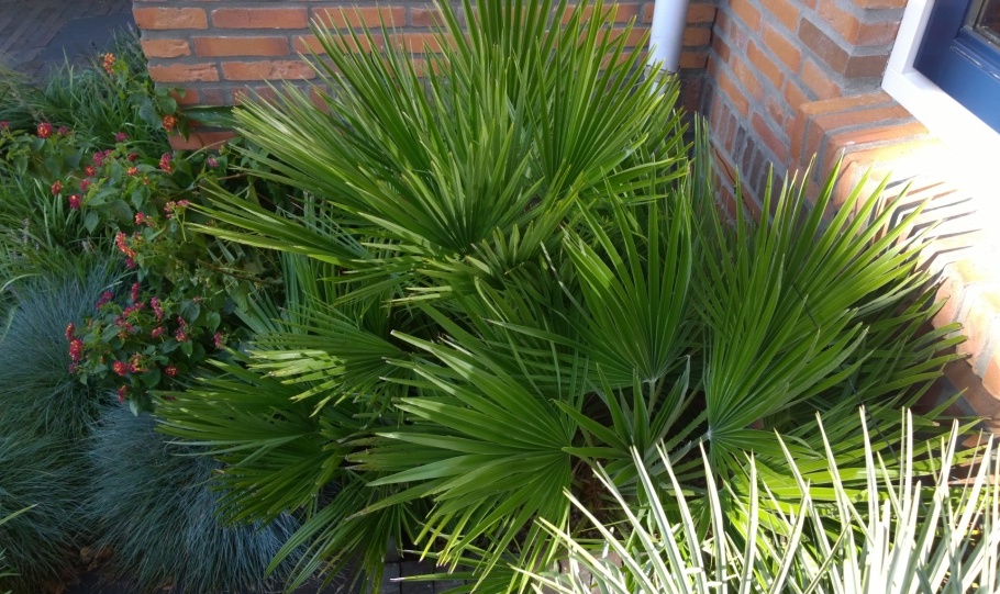 Hoi Herman, dank je. De Trithrinax staat pal op het zuiden vlakbij de voorgevel, een warme bakstenen muur. Droog ook daardoor. Water geven doe ik niet bij deze soort. Hij blijft bij mij ook wat gedrongen, maar de kleur is goed en iedere kant heeft dit jaar vier bladeren gemaakt. kijk maar naar de fotos, de eerste is van augustus 2013. Daar zie je wat bladeren met lange bladslippen, maar die zijn binnen aangemaakt. De rest is allemaal puur buitenblad. Ik heb m in juni 2013 geloof ik uitgeplant. De tweede foto is dus heel recent. Heel ander blad, korter, gedrongen, maar zeer scherp/puntig en fraai staalblauw.