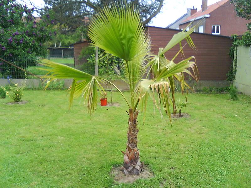 De palm staat nu ongeveer 1 maand in mijn tuin. De buitenste bladeren hadden een kleine beschadiging bij transport. De bladeren waren in de beginne donkergroen, maar beginnen nu stilaan lichtgroen te worden. Ik zal een poging wagen om de palm door de komende winter te loodsen, wat evenwel niet evident is denk ik voor dit type. Maar als hij zonder krachten de winter moet ingaan, maakt hij veel minder kans denk ik.