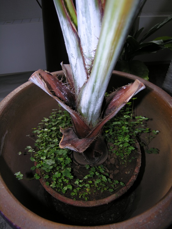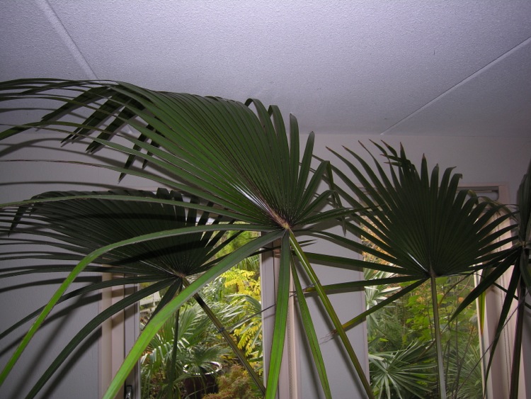 De methode is dus inderdaad toepasbaar zonder een al te groot risico op falen en is dan vergelijkbaar met de methode van wortelsnoei die bij bonsai wordt toegepast. Sabal is een trage groeier, misschien dat beschadiging van de wortels daardoor minder zichtbare gevolgen heeft. Ik heb wortelsnoei met name toegepast wanneer een palm zichzelf uit de kuip drukte, omdat ik geen grotere kuip kon of wilde gebruiken. Als dat niet het geval is, twijfel ik aan het nut van zo'n operatie, tenzij het substraat totaal verpieterd is door bijvoorbeeld het gebruik van hard leidingwater. Hier in de woonkamer staat een grote Latania die ik vast wel eens heb getoond. De palm verkeert in puike conditie ondanks dat deze al sinds aankomst in de originele rode klei staat. De pot meet slechts 24 x 24 Ø cm. Desondanks draagt de palm 6 puntgave grote bladeren en is een 7e op komst. Dus Eduard mijn vraag is, deze succesvolle operatie die je bij deze Sabal heb uitgevoerd was die wel echt nodig? De oorspronkelijke wortelkluit zag er naar mijn mening kerngezond uit evenals trouwens de palm !