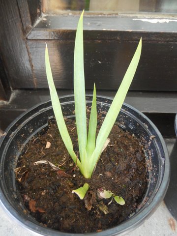 Ziet er niet echt uit als een Iris, maar ik kan het mis hebben. Zo te zien zijn de bladeren bol en wellicht hol . Het zou dus een soort vetplant kunnen zijn? Heb je een betere foto, wat meer van bovenaf en wat dichterbij?