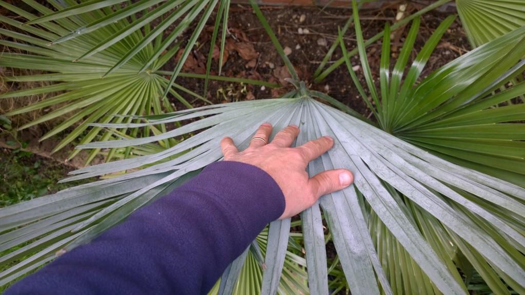 Vandaag mijn princeps vrijgemaakt van een dikke laag blad. Enigszins gehavend door het gure weer op zijn tijd (geen afdak dit keer), maar deze is ook deze winter prima doorgekomen. En ook al hebben we nauwelijks winter gehad, toch is de kans op schade bij zwakke soorten groot in kwakkelwinters. Wat dat betreft scoort deze in mijn ervaring nog steeds goed en zie ik nog geen verschil met fortunei wat winterhardheid betreft. Het enige, en dat kun je op de foto wel zien, is de licht gelige zweem over de bladeren in het voorjaar. Ik zie dat ieder voorjaar en in de komende weken trekt dat weer weg. Nu staat ze bij mij wel op erg schrale grond, maar bij andere palmen in mijn tuin zie ik dat niet.