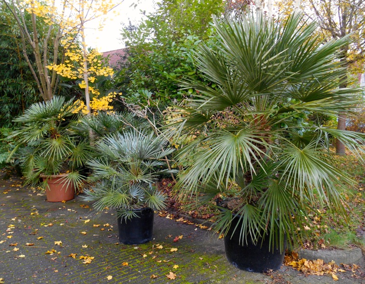 Chamaerops humilis is een geval apart omdat je bij deze soort een grote diversiteit aan verschijningsvormen (fenotypes) kunt aantreffen, zie elders. Omdat dit geslacht al zo lang in cultuur is zijn naast enkele geïsoleerde natuurlijke varianten zoals Cerifera en Vulcano ook diverse 'rassen' tot ontwikkeling gekomen vergelijkbaar met huisdieren de hond: van pinkster tot Deense dog bijvoorbeeld. viewtopic.php?f=47&t=15339 Vergelijk bijvoorbeeld de 2 afgebeelde palmen 'David' en 'Goliath' Chamaerops. De bescheiden David een 'Cerifera' neemt al jaren genoegen met dezelfde kuipmaat terwijl ik Goliath noodgedwongen dit voorjaar moest verkuipen omdat het gietwater er aan alle kanten afliep. Verplaatsen met een steekwagen lukt nog net, maar ik moet er met mijn volle gewicht tegenaan :lol: De beide palmen zijn overigens van de vrouwelijke kunne en de 'Cerifera' draagt zaden.