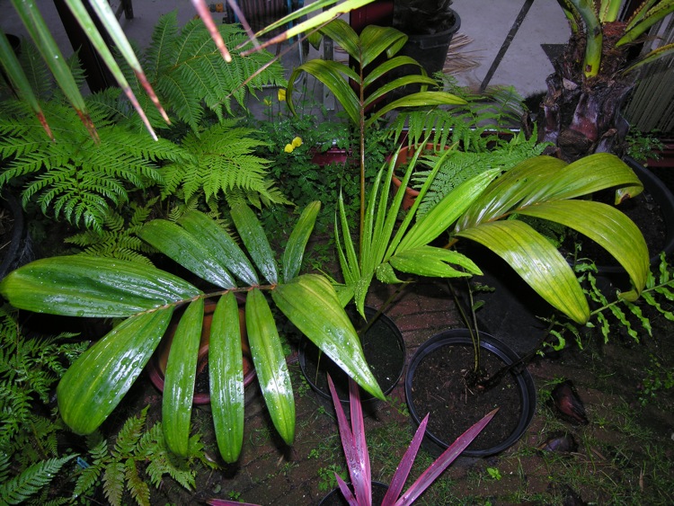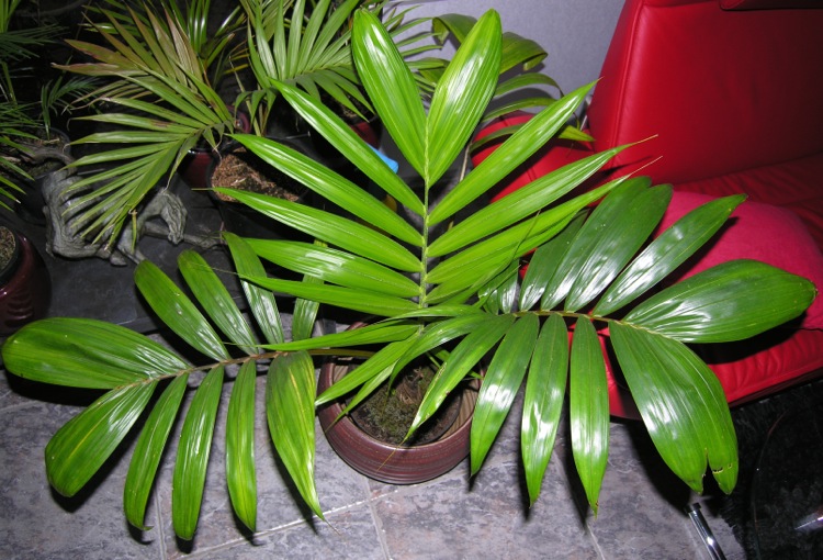 Ik verloor onlangs 2 bladeren van 4, waarvan 1 zoals te verwachten geleidelijk en kort daarna een tweede onverwacht snel, zodat de palm er nu ietwat onttakeld bijstaat. Staat nu buiten in de hoop dat dit de nieuwgroei stimuleert. Deze palm is koudegevoelig en verdraagt geen vorst (zone 10B).