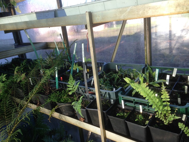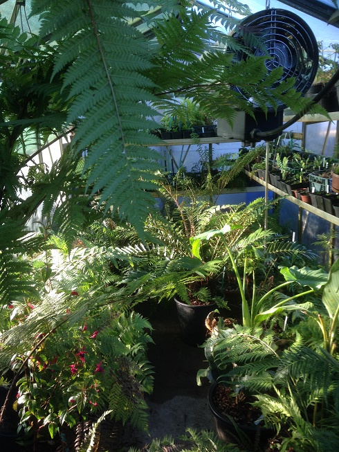 Een deel grotere boomvarens staan in de garage, andere varens boven op een kamer en hier in de serre: