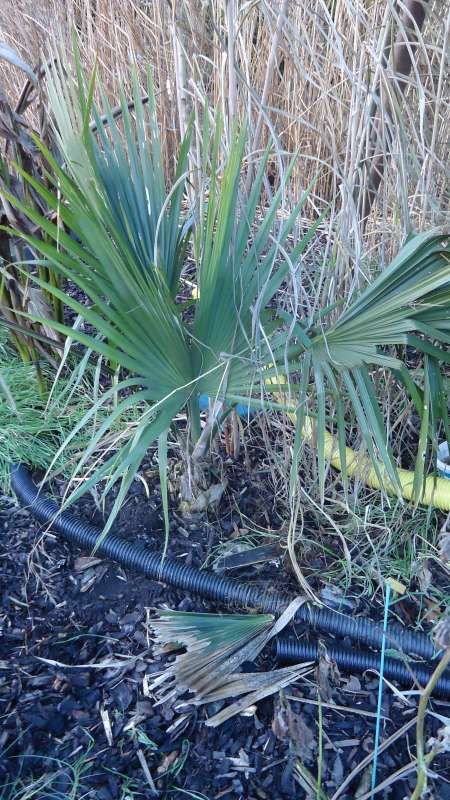 Bedoeling was om er een bigbag overheen te trekken maar ik zit zonder. Tegen vorst kunnen ze namelijk echt wel goed maar het moet dan wel liefst droog zijn dus niet met een pak sneeuw op de bladeren of eerst regen en dan vorst. Dan verliezen ze bladeren of ze worden zo lelijk dat ik ze er in het voorjaar zelf afknip. Maar het is al gebleken dat als ze er zelfs zo erg aan toe zijn dat de speren en al er uit komen ze evengoed redelijk snel terug herpakken met nieuwe groei. Ik ga straks even 4 paaltjes kopen en dan nog een bigbag, dan ben ik gerust. Enkel voor de grote trouwens, die kleine heeft nog nooit bescherming gehad en staat er toch al een jaar of 6-7.