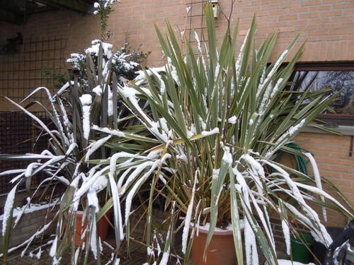 Als de Phomiums deze winter overleven zal ik toch moeten ingrijpen, ze worden toch wat groot en te zwaar, dus een zware klus om deze knapen te scheuren(doorzagen), grotere potten is geen optie daar de terrasjes niet meegroeien en de tuin ook niet.