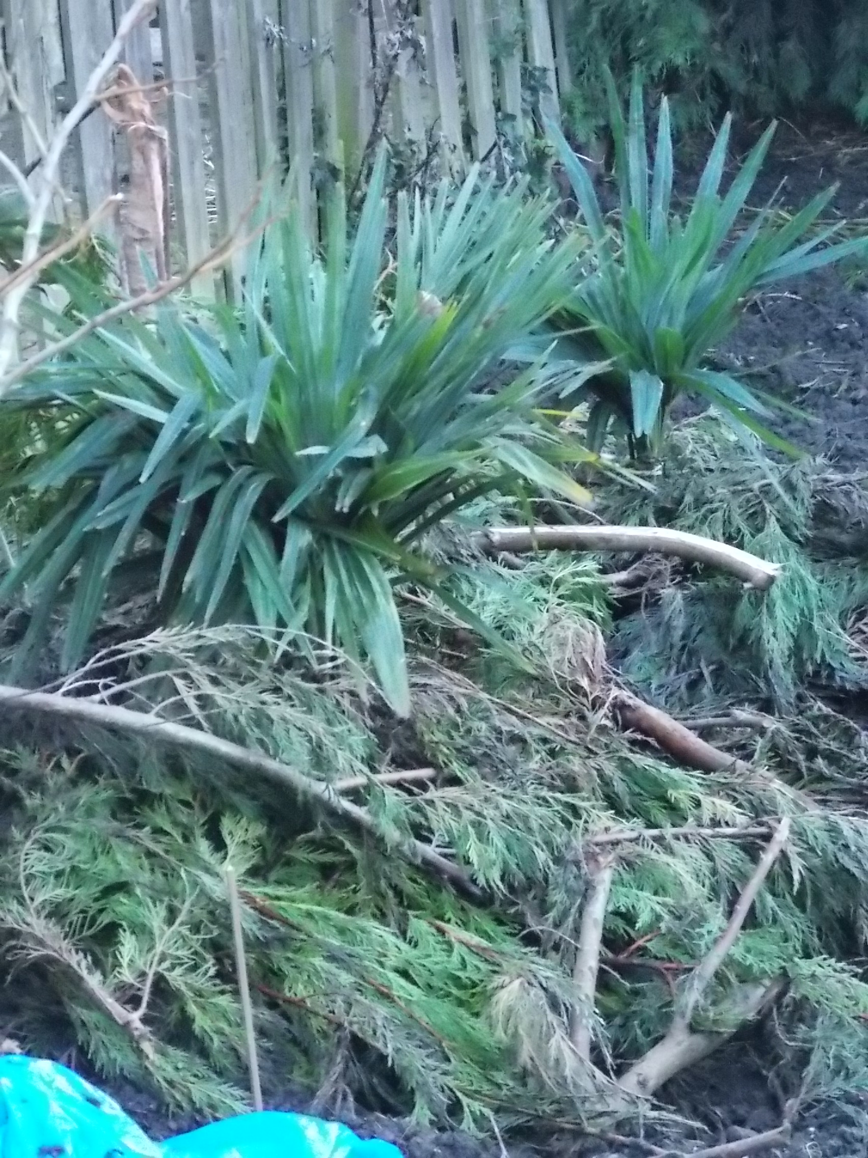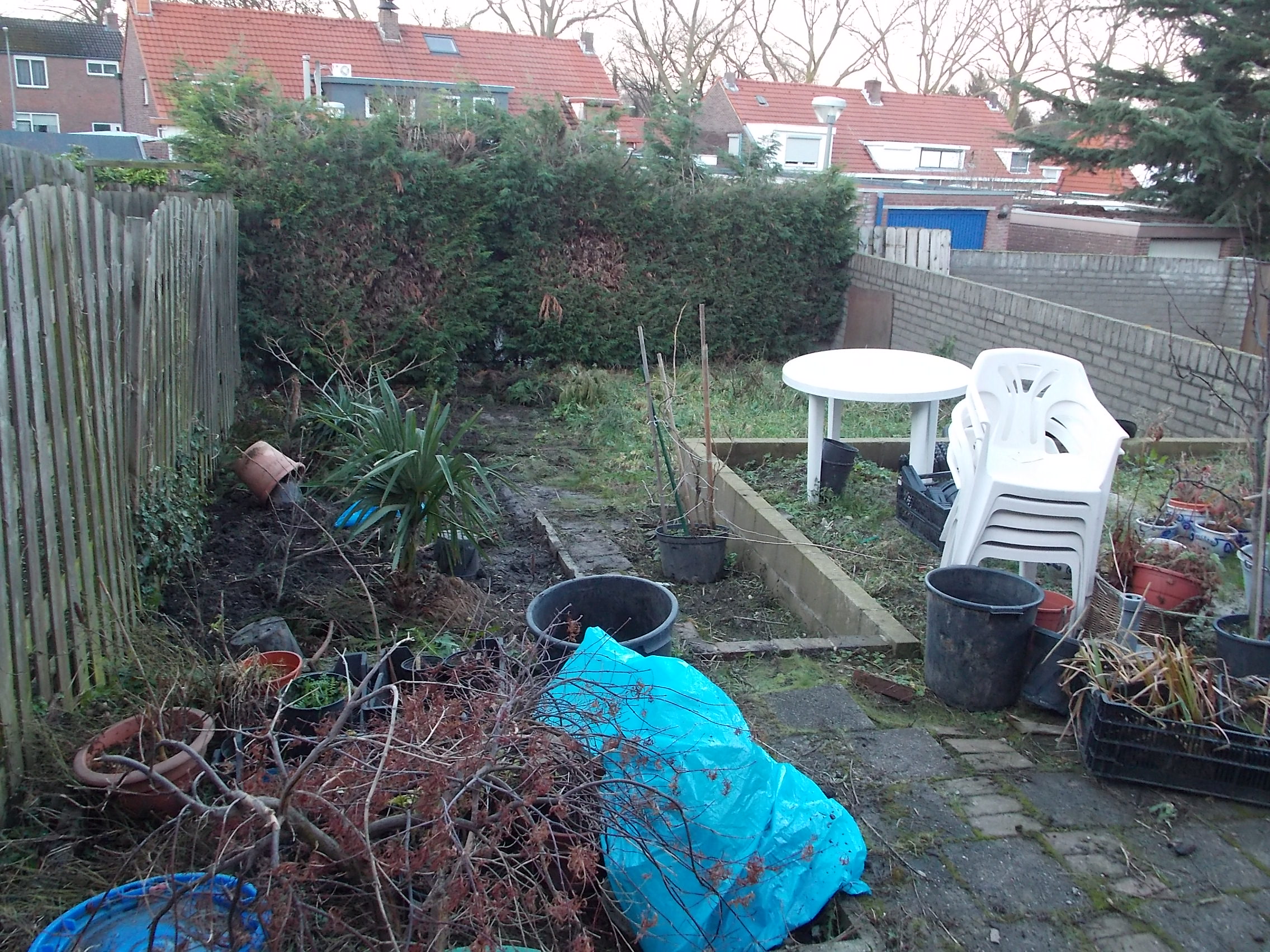 De eerste foto's van de achtertuin, ik ben (natuurlijk) al begonnen aan het linker onderste gedeelte zodat ik vlak voor de sneeuwval de Trachycarpussen de grond in had. Geïsoleerd met lange coniferentakken die van de heg af zijn gesnoeid. (de heg is een paar jaar niet gesnoeid, zal ook niet meer mooi gaan worden helaas. Ook dat is iets voor later: de linker schutting met de buren zal vervangen moeten worden = verrot en de coniferenheg eruit en ook daar een schutting erin.