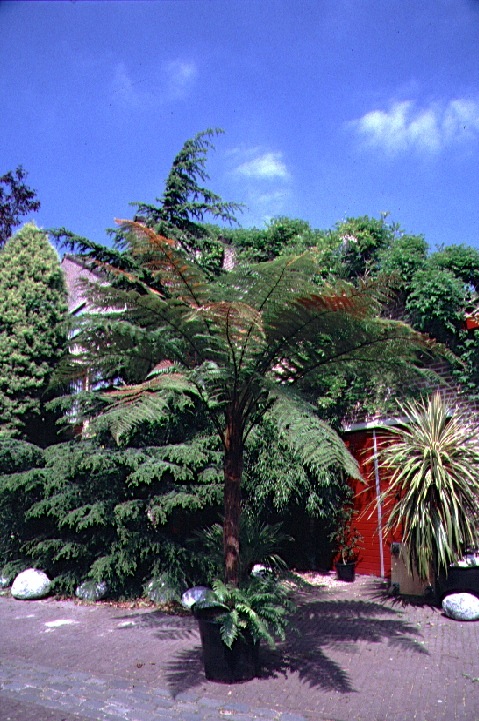 Deze Phoenix roebelenii in kuip heeft een van de recente winters in de nieuwe (vorstvrije) koude kas niet overleefd. In de voormalige gevelkas bleef het wintermin. beperkt tot 10 °C. De Livistona australis (20/21) is een van de weinige langjarige overlevenden.
