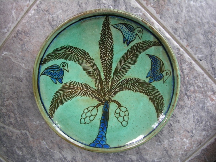 Geïnspireerd door een bericht van een verdwaalde muntenverzamelaar, waarbij Ramon een munt toont met de afbeelding van een groep palmen, lijkt het me aardig een topic te introduceren over attributen met daarop palmen of exotische planten afgebeeld. Hierbij de aftrap met mijn exclusieve eetnap afkomstig uit een Egyptische nederzetting in de woestijn. Aangeschaft overigens in Utrecht.