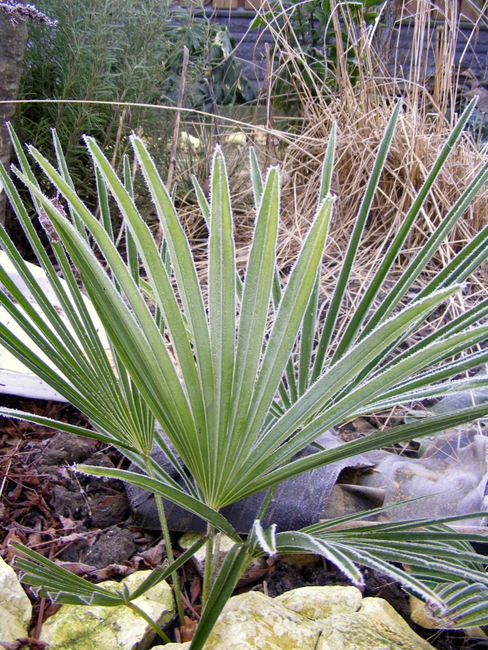 De Aspidistra elatior overleeft deze korte vorstnacht wel, het is tenslotte een zone 8 plant. Deze plant staat hier al jaren verscholen als verschoppeling onder een Trachycarpus.
